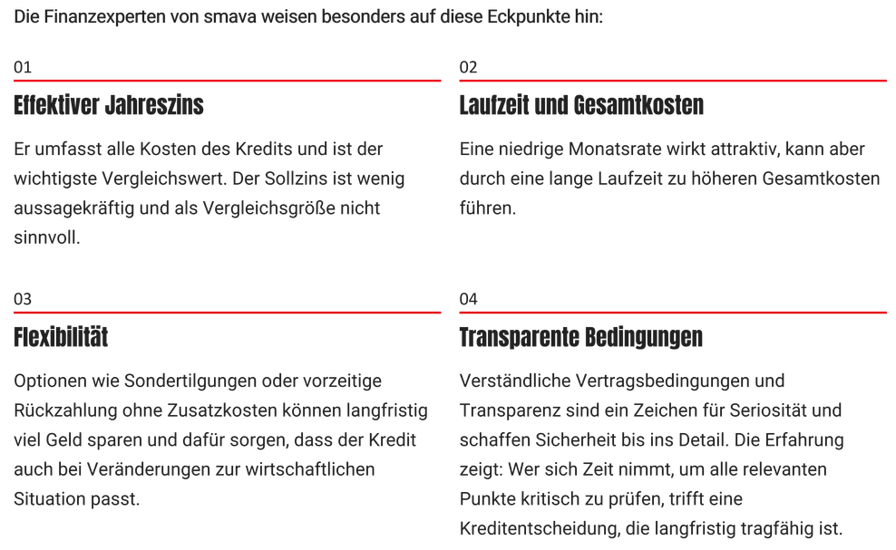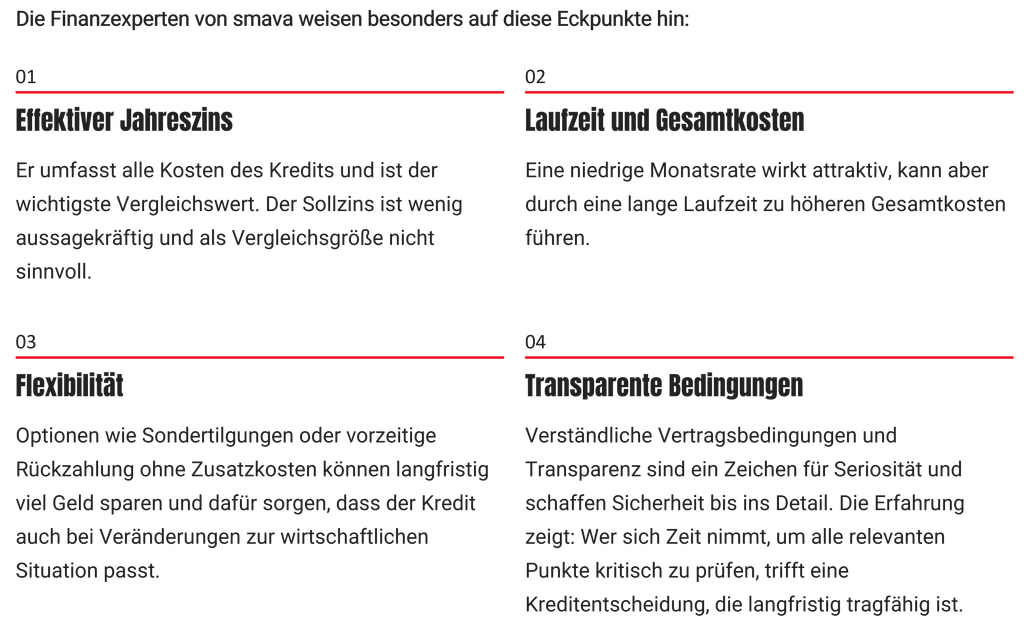 Ein günstiger Zinssatz ist nicht alles, wenn es um die Auswahl des passenden Kreditangebotes geht. Wer wirklich sparen und auf ein wirtschaftlich sinnvolles Finanzinstrument setzen möchte, sollte mehrere Faktoren im Blick behalten. Die Finanzexperten von smava weisen besonders auf diese Eckpunkte hin: