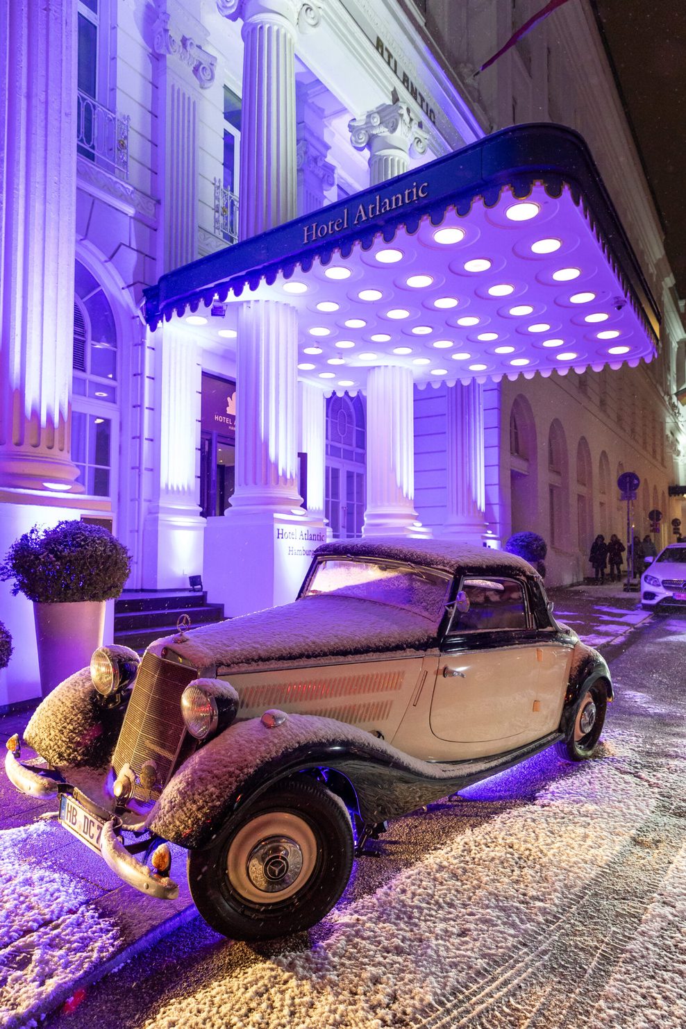 Der historische Mercedes vorm Eingang des „Atlantic“
