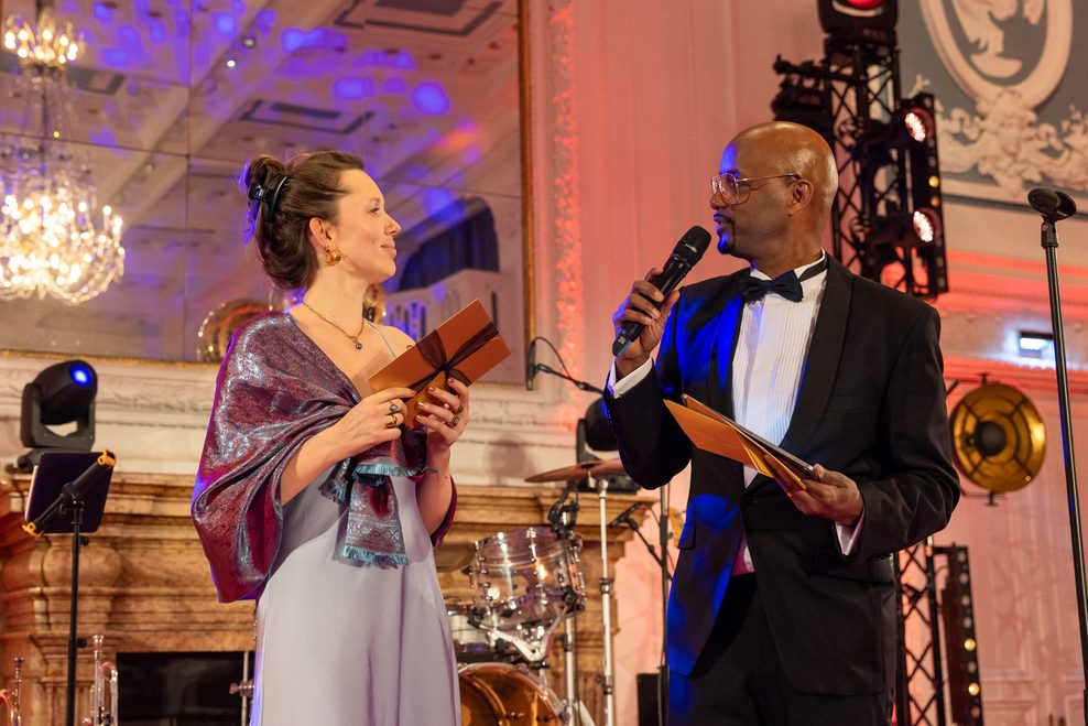 Moderator Yared Dibaba überreicht einen Tombola-Preis an eine Gewinnerin - Venia Peuker Glanzvoll: Der Fest-Saal des „Atlantic“