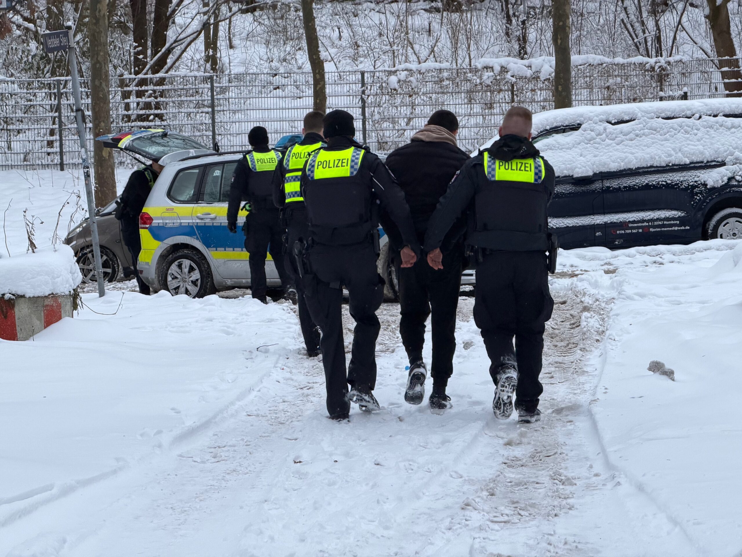 Am Veddelstieg auf der Elbinsel Veddel gab es am Nachmittag einen größeren Polizeieinsatz. Polizisten wollten einen psychisch auffälligen Mann einem Arzt vorführen. Bereits am Vortag hatte sich der Mann geweigert.