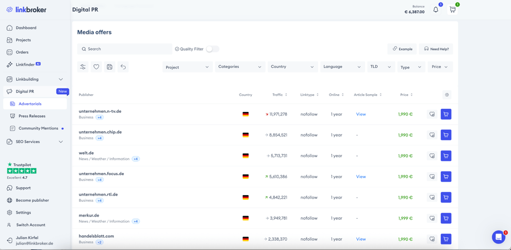 Bisher war die Medienlandschaft eine Festung. Der direkte Zugang zu großen Medienhäusern wie dem Handelsblatt, Forbes, der Wirtschaftswoche oder der FAZ war meist hinter massiven Budgets klassischer PR-Agenturen versperrt. Linkbroker bricht dieses Monopol auf. Basierend auf einem verifizierten Netzwerk von über 100.000 direkten Medienkontakten hat das Unternehmen das PR-Geschäft und den Aufbau hochwertiger Backlinks industrialisiert.