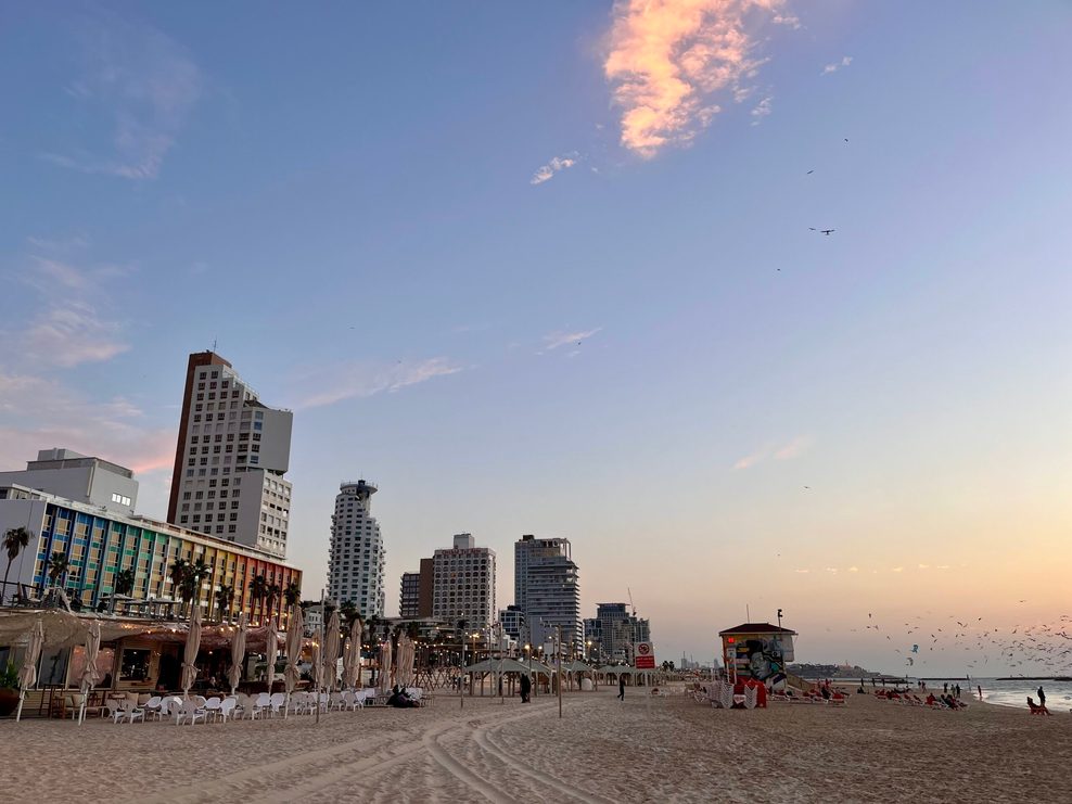 Tel Aviv erweckt tatsächlich den Eindruck, als wäre nichts gewesen. Hier leben die säkularen Israelis, hier gab es die Massenproteste gegen den Kriegskurs der Regierung. Die Stadt ist voller junger Menschen, Wolkenkratzer wachsen in den blauen Dezemberhimmel, die Restaurants sind voll, vor den Cafés hängen Pride-Flaggen.