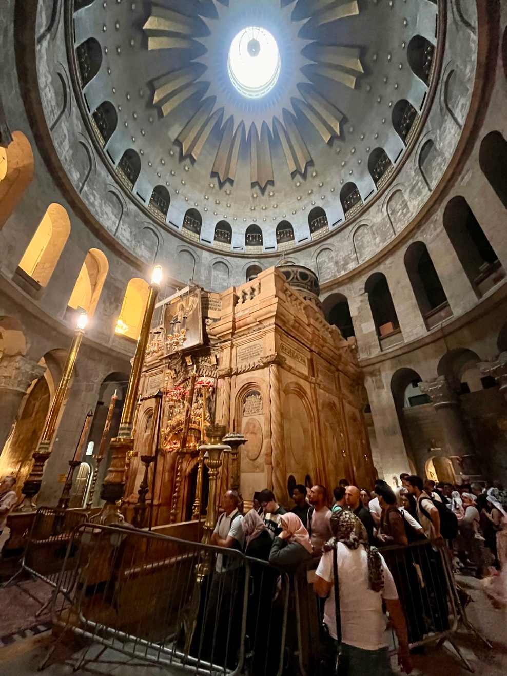 In der Grabeskirche, einem heiligen Labyrinth, das sich sechs untereinander zerstrittene Kirchen teilen, steht nur eine kleine Gruppe vor dem Grab Jesu Christu. Wartezeit: etwa 30 Minuten. Vor dem Krieg waren es gerne mal fünf Stunden, die Schlange zog sich bis zur Eingangstür.