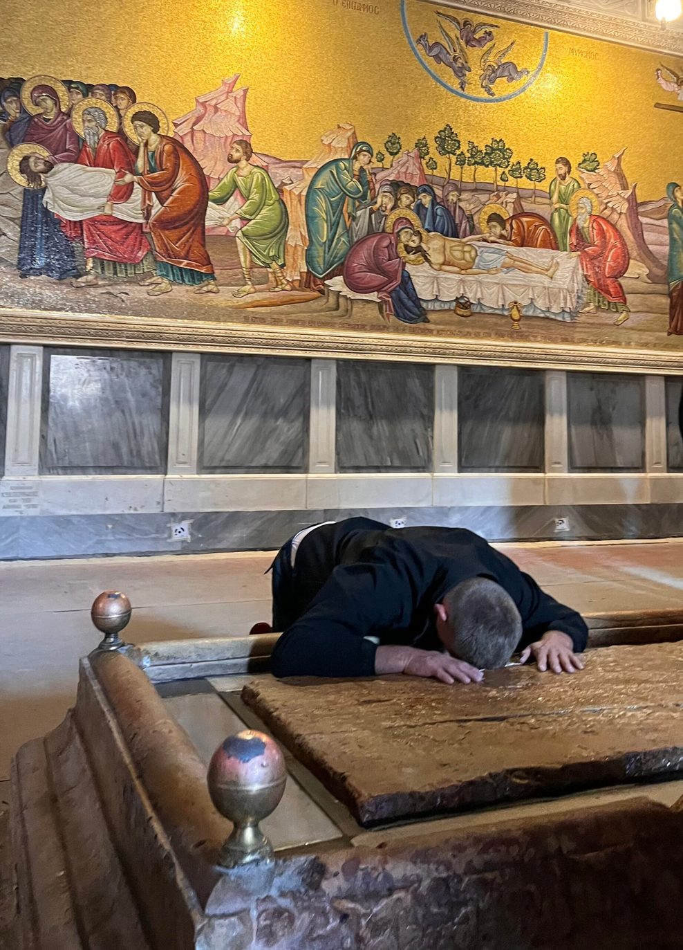 Ein Mann betet auf dem Stein, auf dem Jesu Leichnam für die Bestattung vorbereitet worden sein soll. - Privat. Kaum Wartezeit: Vor dem Grab von Jesus Christus bilden sich derzeit nur kleine Schlangen.