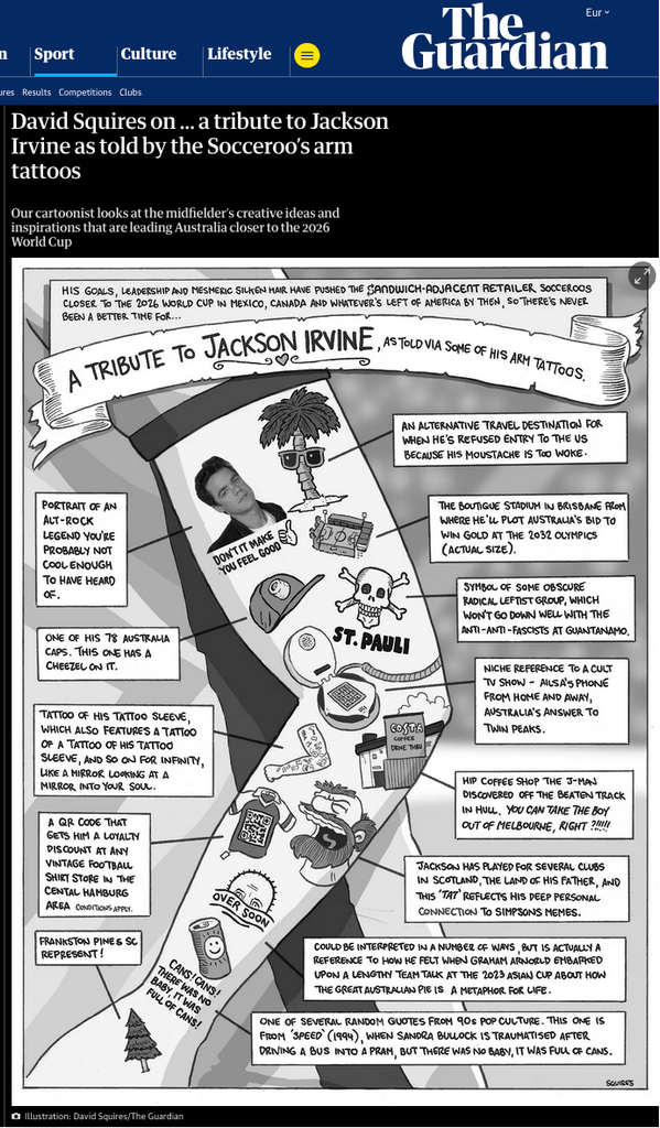 Der englische Kult-Zeichner David Squires, der seit 16 Jahren in Australien lebt, nutzte die Gelegenheit, um ein „Tribut an Jackson Irvine anhand einiger seiner Arm-Tattoos“ anzufertigen, das er im „Guardian“ veröffentlichte. Insgesamt 13 Tätowierungen platzierte Squires auf dem Arm, allesamt fiktiv, aber dank der dazu gestellten Kommentare auch aussagekräftig.
