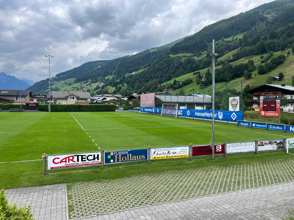 Auf der Anlage der heimischen Turn- und Sportunion Bramberg, ein österreichischer Viertligist aus der Salzburger Liga, ist alles präpariert für die erste, für Dienstag angesetzte Einheit. Die beiden Geläufe in der Smaragd-Arena, die dem Team von Steffen Baumgart zur Verfügung stehen, sind von blauen Bannern samt HSV-Logo sowie Sponsoren-Branding umrandet, frisch gemäht und zudem von einem Café-Bistro umgeben. Auch Fahnen wehen schon.