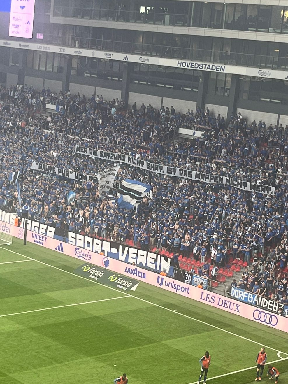 9000 HSV-Fans werden es am Ende in Kopenhagen gewesen sein. Was dieser Verein für Massen begeistern kann, zeigte sich erneut in eindrucksvoller Art und Weise – und das in einem Testspiel. Auch wenn der HSV die erste echte Prüfung mit 0:1 verlor, feierten die Fans beider Lager ihre freundschaftliche Verbindung eindrucksvoll mit Pyrotechnik und Wechselgesängen. Doch es gab auch Kritik auf beiden Tribünen zu sehen. Unter anderem taten die Ultras mit einem Spruchband ihren Unmut über das neue HSV-Trikot kund.